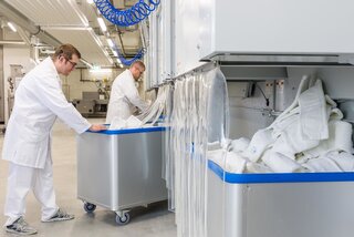 Da sich der Prozess der professionellen Aufbereitung von Feuchtwischbezügen und Mikrofasertüchern in einzelne Arbeitsschritte aufgliedern lässt, die größtenteils auch ohne schweren Körpereinsatz zu erledigen sind, lässt sich bei dieser Art der industriellen Wäscherei im Gegensatz zu üblichen Großwäschereien ein Teil der Arbeitsplätze durch Menschen mit Handikap besetzen. Der Anteil unserer Arbeitnehmer mit einer Schwerbehinderung liegt derzeit bei ca. 40%.